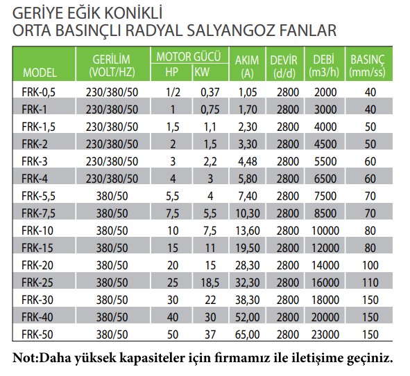 ÜRÜNLERİMİZ: 2000 m³/h ile 14.000 m³/h arası, 40 mmSS’den 120 mmSS’ye kadar standart alçak basınçlı sık ve seyrek kanatlı olup, direkt akuple motorlu, pervanesi öne eğimli, montaj kolaylığı olan aynı gövde üzerinde yön değiştirme özelliğine sahip ürünlerdir. TSE standartlarına uygun olarak her türlü ölçümleri yapılır. Talep üzerine daha büyük kapasitelerde üretim yapılmaktadır. Frekans invertörü (hız kontrol cihazı) ile de çalıştırılabilir.
