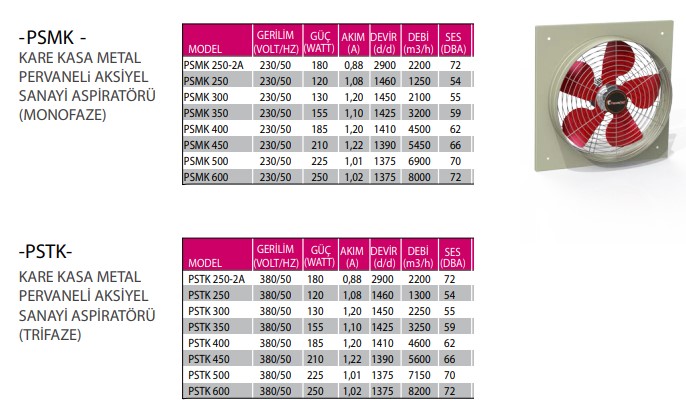 KARE KASA METAL PERVANELİ AKSİYEL SANAYİ ASPİRATÖRÜ