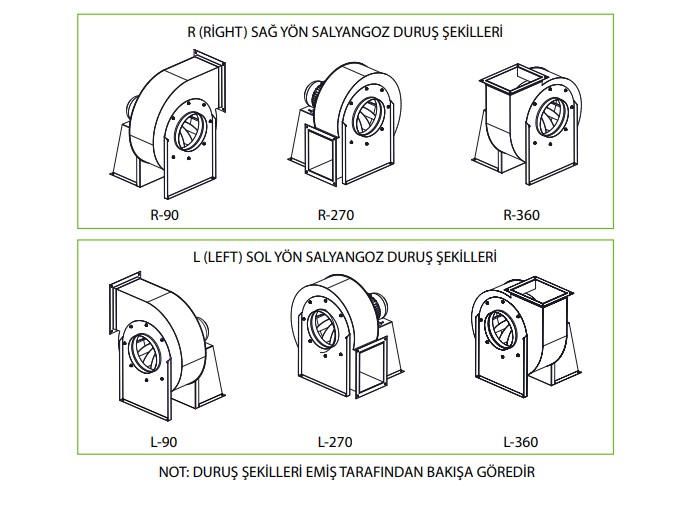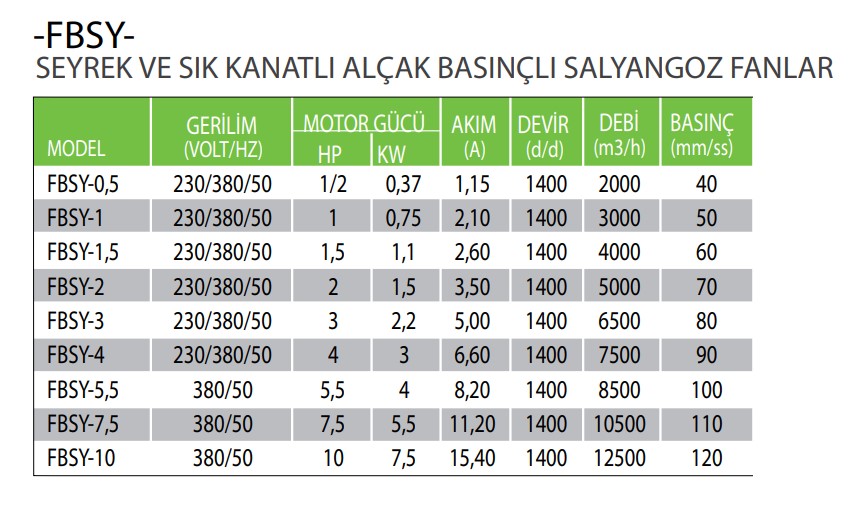 ÜRÜNLERİMİZ: 2000 m³/h ile 14.000 m³/h arası, 40 mmSS’den 120 mmSS’ye kadar standart alçak basınçlı sık ve seyrek kanatlı olup, direkt akuple motorlu, pervanesi öne eğimli, montaj kolaylığı olan aynı gövde üzerinde yön değiştirme özelliğine sahip ürünlerdir. TSE standartlarına uygun olarak her türlü ölçümleri yapılır. Talep üzerine daha büyük kapasitelerde üretim yapılmaktadır. Frekans invertörü (hız kontrol cihazı) ile de çalıştırılabilir.