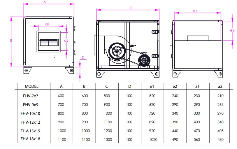 MALZEME: Kasası 0,70 mm ile 1 mm arasında galvaniz sacdan üretilir. Çift cidar olarak arasına 20 mm kalınlığında cam yünü doldurulmuştur. İskeleti alüminyum profilden olup köşeler plastiktir. Motor ve fan şase üzerinde kayış kasnak tahriki ile çalışmaktadır. Titreşim önleyici lastik takozlar bulunup özel contalarla sızdırmazlık sağlanmıştır. Atış ağzı bağlantısı konnektör ile bağlanmıştır.